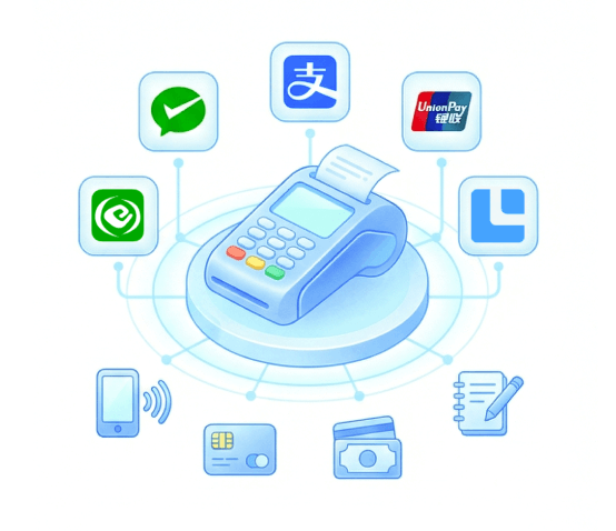 支持现金、微信扫码、支付宝扫码、储值卡、银联任意组合支付