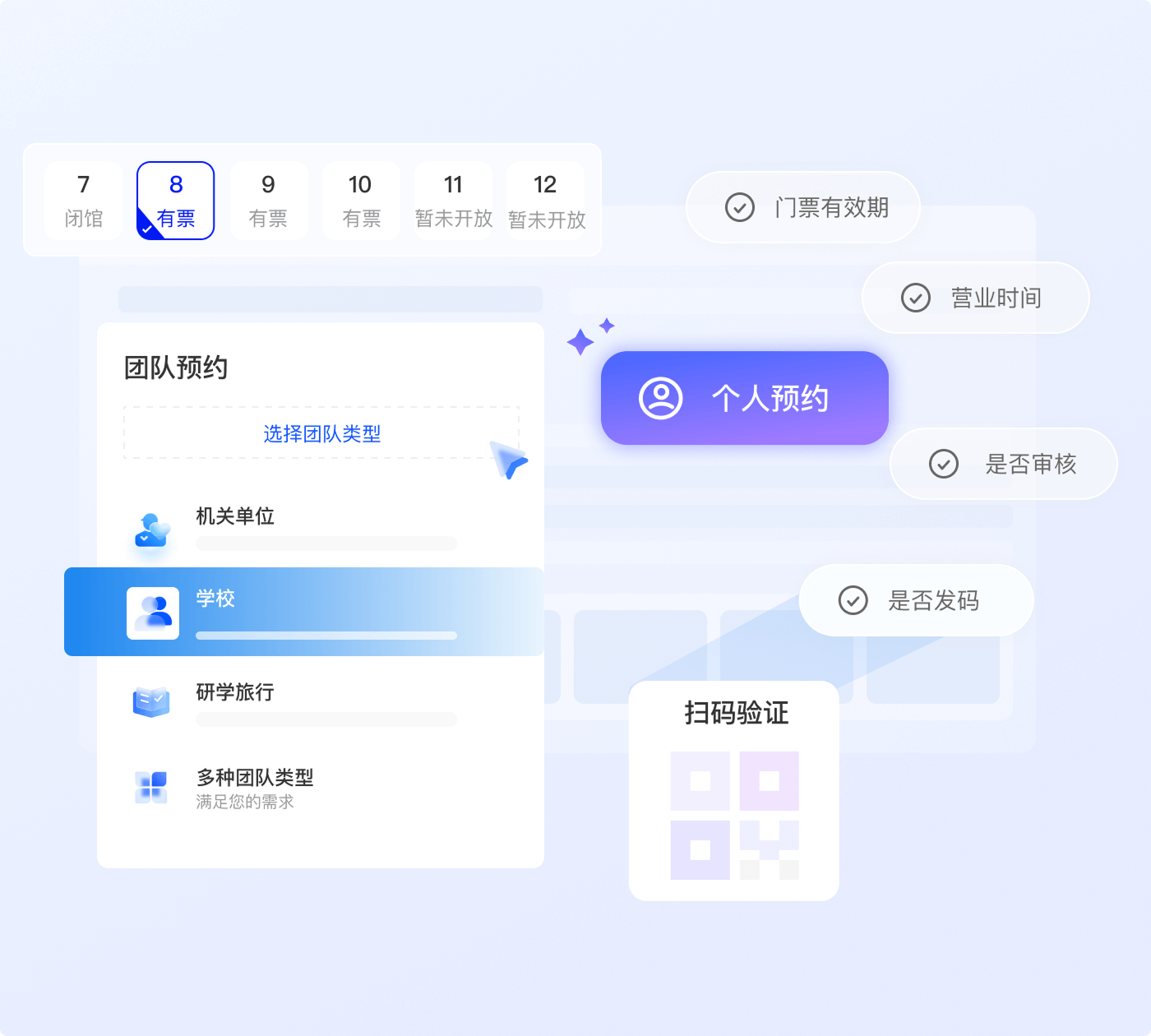支持事业单位、学校等团队类型自定义,可设置预约函、讲解服务及费用规则
