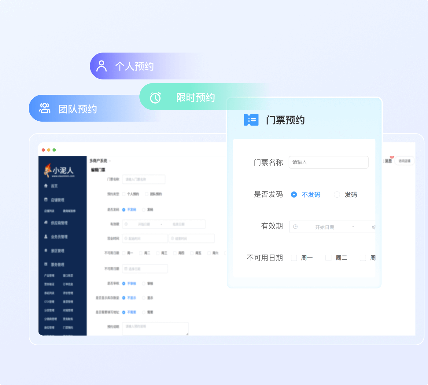 免费预约支持0元发码或无码预约,购票预约可自定义价格、有效期等参数