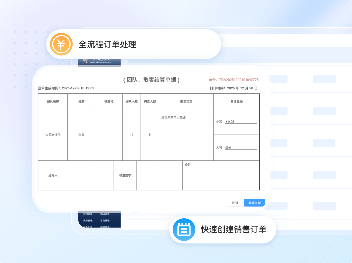 快速创建销售订单,需选定关联团队、导游及门票。支持多种支付方式,一键打印单据。