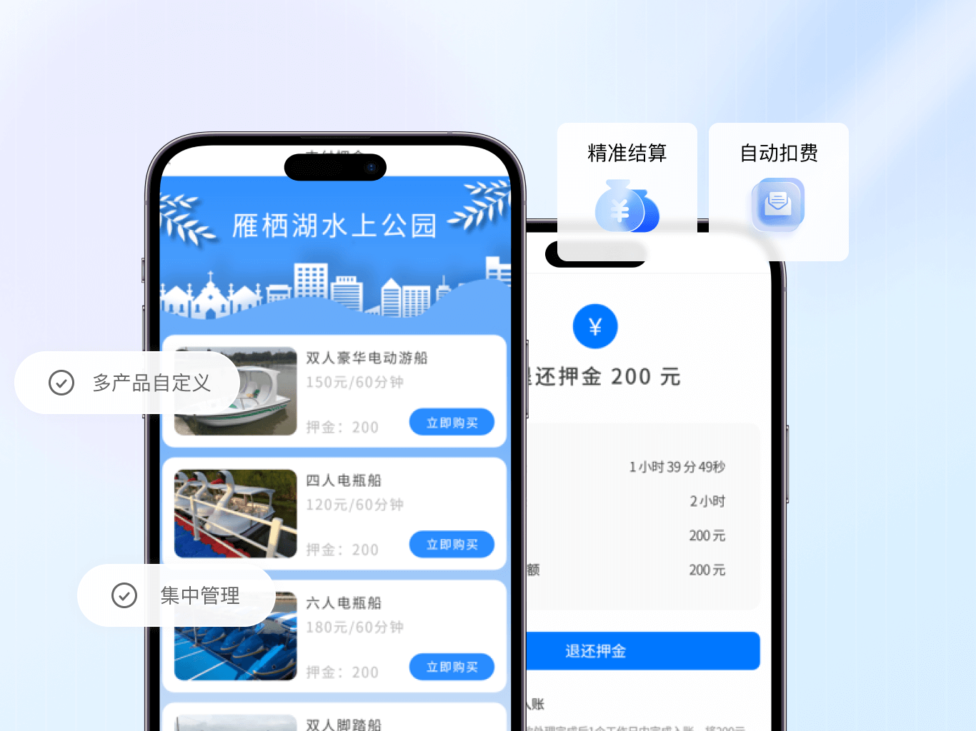 后台可集中管理多类设施配置及押金订单,游客通过扫码即可完成支付与退款操作