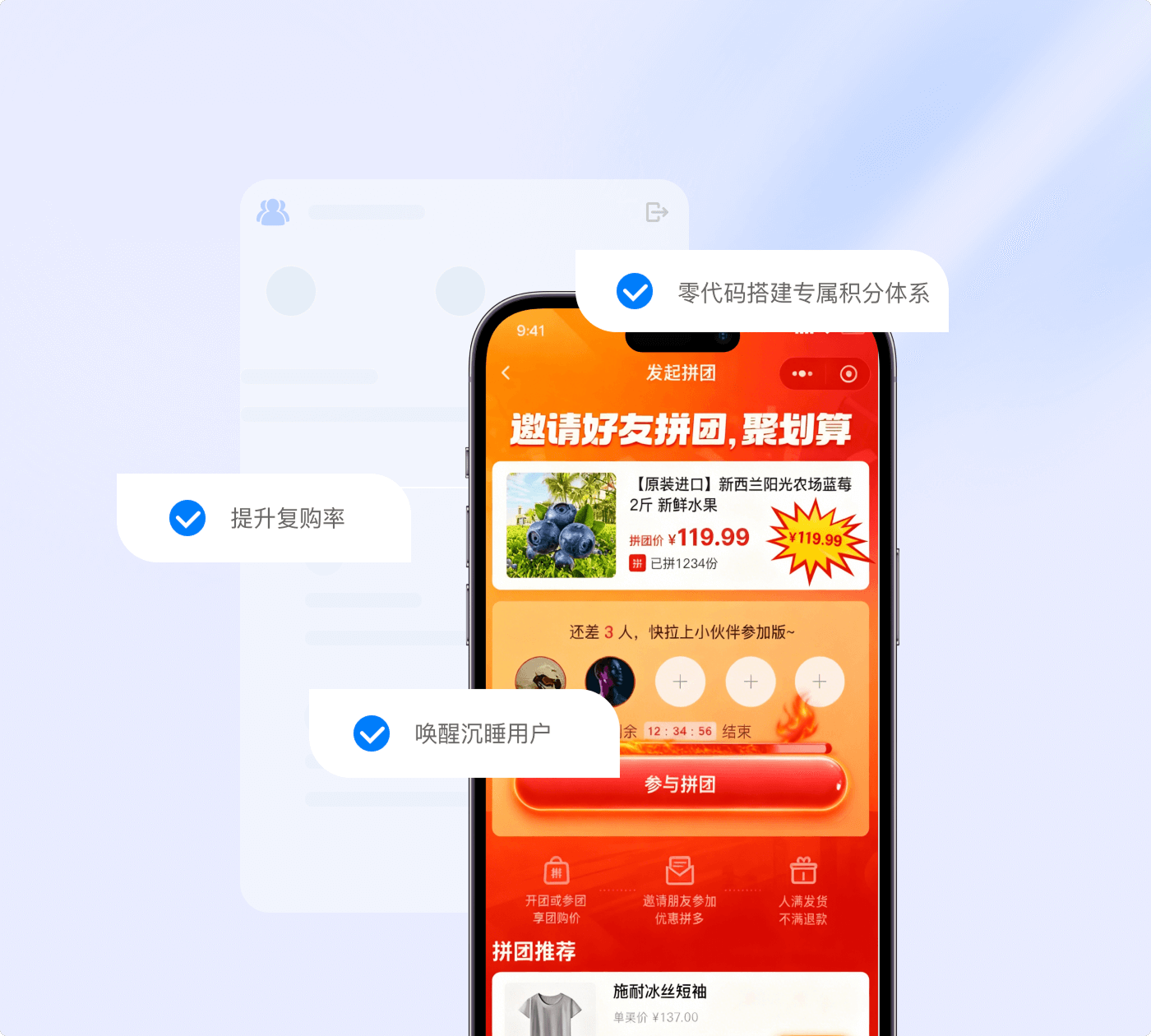 微商城支持6端(微信公众号、小程序、小红书、抖音、支付宝、快手)同步展示,提供50+营销活动及页面装修组件。