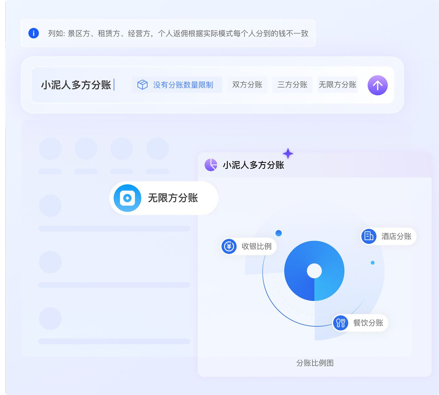 支持门票、酒店、餐饮、收银、停车场、共享设备及服务等多业态和场景分账