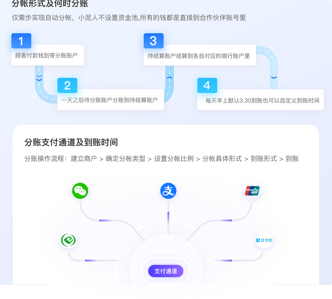 支持市集商户、餐饮摊位等多方自动分账,交易资金T+1自动到账,安全合规。